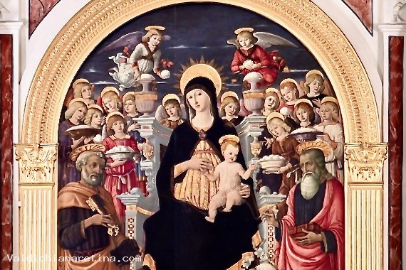 Presenta la Madonna in trono col Bambino fiancheggiati dai Santi Pietro e Giovanni Evangelista e davanti ai Santi Lorenzo e Caterina da Siena.