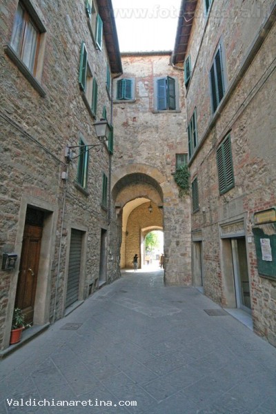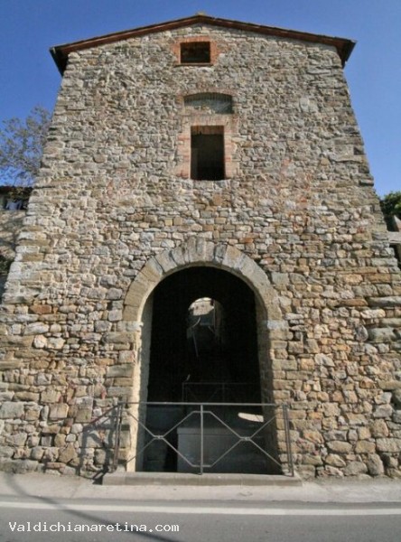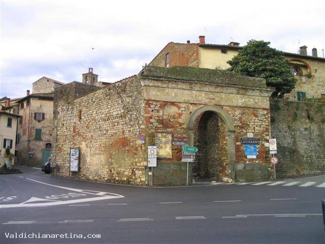 Nella cronaca del 1371 di Neri di Donato risulta che " Le mura di Lucignano in Val di Chiana le fecero i senesi…." , infatti proprio nel 1370 i lucignanesi decisero di sottomettersi a Siena, ma la sistemazione del 1371 ricalca in parte una struttura urbana consolidatasi tra il '200 ed i primi anni del '300, come risulta da documenti ritrovati nel Duomo di Arezzo e risalenti al 1330. Le tre porte principali del paese sono: Porta S. Giovanni (detta porta di sotto), Porta S. Giusto ( detta porta di sopra) e Porta murata, così chiamata dopo la sua chiusura probabilmente nel '500, mentre i resti delle torri circolari che vediamo sul circuito murario sono successivi e risalgono alla metà del '400. Porta S. Giovanni è esposta ad est, presenta una pianta irregolare a cinque lati, è costruita con muratura in pietra con rincalzi in mattoni, della sua copertura rimangono solo alcune tracce, il portale a tutto sesto è in pietra. Incamminandosi in senso antiorario lungo la via di Circonvallazione, dopo pochi metri troviamo una torre circolare (detta torre del Picconi dal nome del proprietario) ancora ben conservata; proseguendo ancora il nostro cammino lungo le "mura ricche" arriviamo a Porta S. Giusto esposta a sud-ovest verso Siena. Questa presenta una pianta rettangolare sormontata da una terrazza di copertura, alla quale si accede da una casa privata, sorretta da una volta a botte intonacata; il portale è a tutto sesto con un bugnato in pietra arenaria. L'interno è stato recentemente restaurato. Continuando ancora la nostra passeggiata lungo le "mura povere" arriviamo a Porta Murata esposta a nord-ovest. Anch'essa presenta una pianta approssimativamente rettangolare, una muratura in pietra con rifiniture a mattoni coperta da un tetto a " capanna " ; il portale esterno è a tutto sesto ed è sormontato da due aperture. Da qui parte la strada originaria che collega Lucignano con il castello del Calcione per poi proseguire verso Palazzuolo Alto, nel comune di Monte S. Savino, e da qui in Val d'Arno e a Firenze.