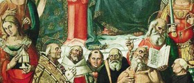 In alto la Madonna viene incoronata, tra gli angeli che suonano, in fondo i Santi pregano insieme.
