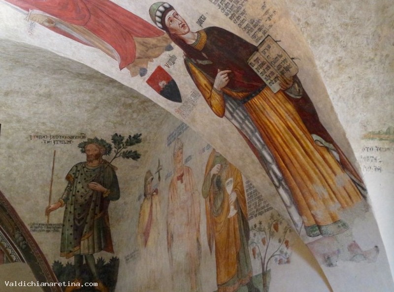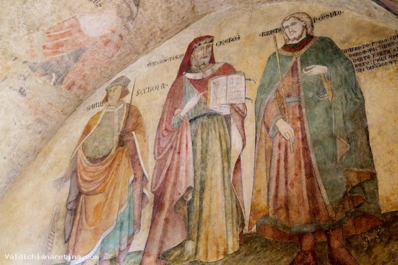 On all dominates the Majesty of Augustine of Marsilio guarantor of justice well administered and well conducted, flanked by Lucignano protectors: St. John the Baptist, San Biagio, San Felice Pope, St. Michael, St. Francis and St. Agatha. The frescoes are obvious references to the painting cycle by Taddeo di Bartolo nell'Anticappella of the first of the '400 Siena Public Palace, when under the influence of humanistic culture, began to decorate the palaces of public rooms with examples of "Good Government ". Another note of interest of this cycle is the presence of many inscriptions taken from the Divine Comedy: for the first time, the heroes are characters that proposed for example for Dante embodied the idea of justice and freedom.