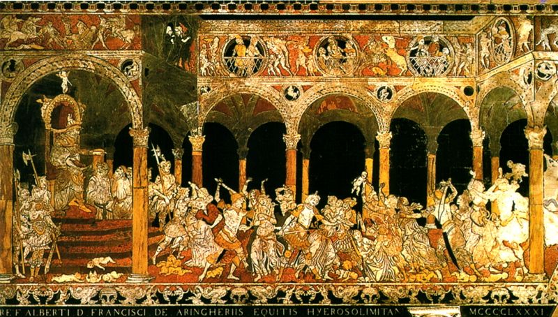 King Herod is seated on a splendid throne Renaissance carved marble, and commands his soldiers to carry out the massacre. The construction technique is different from that used in the aisles for the use of a greater number of colored marbles, used to create zones of shadow and light in accordance with a procedure which is then perfected in the scenes drawn from Beccafumi.