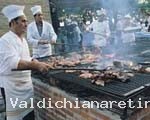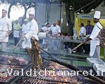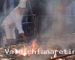 In una gratella gigante di 14 metri vengono cucinate le bistecche alla fiorentina, rigorosamente di carne di razza chianina, cotte al sangue, come vuole l'antica tradizione toscana.