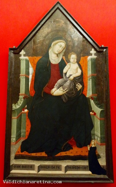 La Madonna in trono col Bambino di Niccolò e Francesco di Segna è una tavola trecentesca dalla forma cuspidata proveniente dalla Chiesa di san Francesco. Lo sfondo, che dobbiamo immaginare dorato, presenta delle punzonature lungo la cornice e intorno ai volti dei personaggi, a disegnare le aureole. In basso sulla destra, si trova la figura di una donna in preghiera raffigurata in dimensioni ridotte rispetto alla Madonna e al Bambino: si tratta della committente dell'opera. La scritta che corre alla base del trono ci svela l'identità della donna “Monna Muccia moglie che fu di Guerrino Ciantari”, una ricca e devota vedova, che donò questa tavola alla Chiesa di San Francesco.