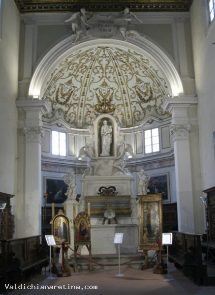 Nella parte inferiore della chiesa, sotto la cantoria entrando a destra, la pila dell’acqua benedetta a forma di calice, è finemente lavorata e ha il piede quadrato con ai lati gli stemmi della Fraternita e della famiglia Medici. Quest’opera in travertino, è simile ad un’altra pila esistente nella chiesa della SS. Trinità.